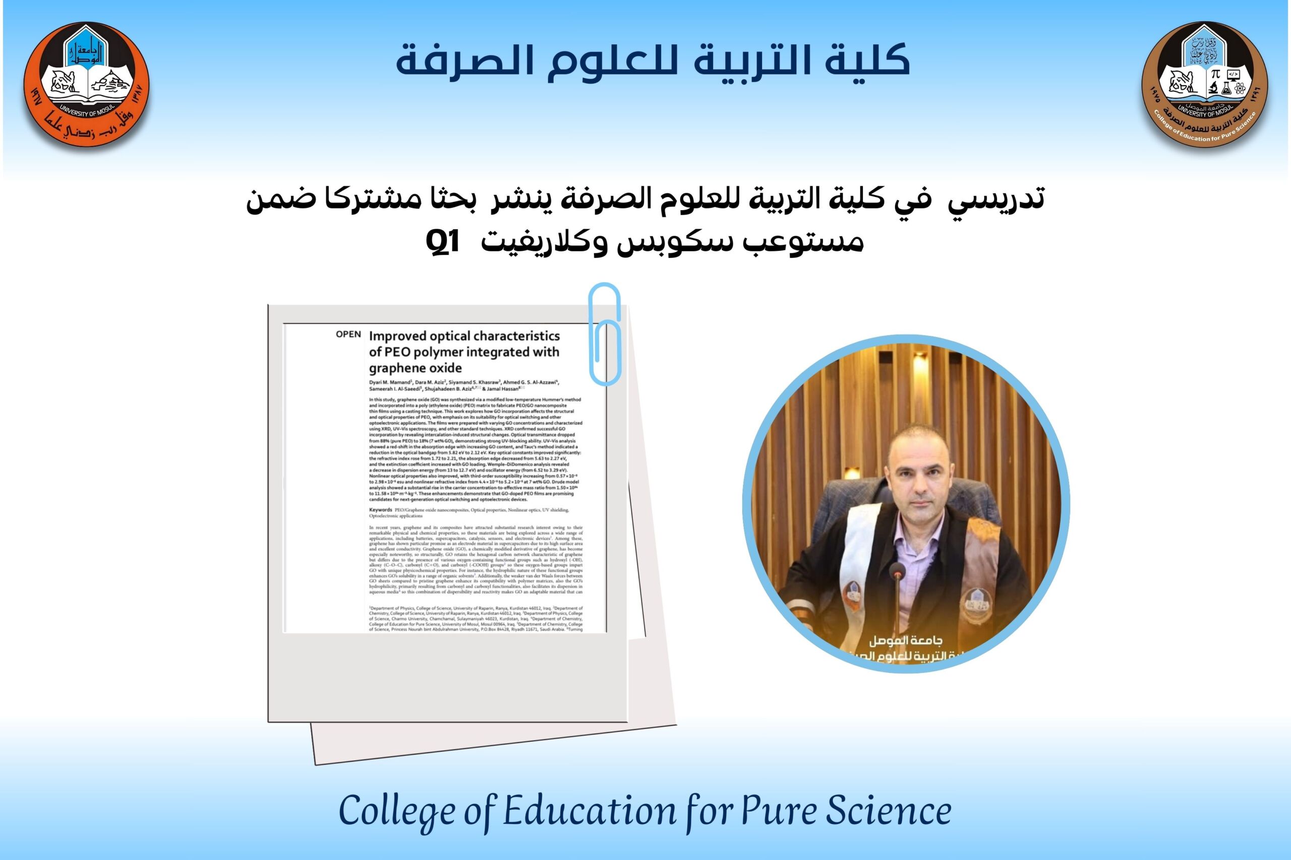 A lecturer at the College of Education for Pure Sciences, Department of Chemistry publishes a scientific research paper (specializing in polymers) in one of the most important and prestigious international journals Q1….