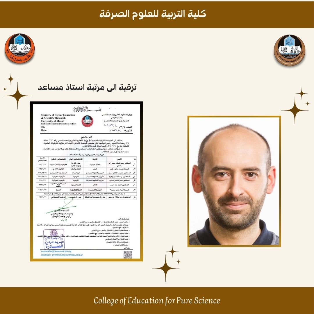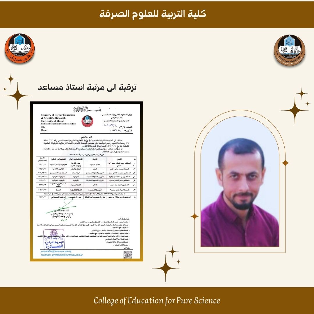 The Deanship of the College of Education for Pure Science, represented by its esteemed Dean, Assistant Professor Dr. Jassim Fatehi Ali, extends its sincere congratulations to Dr. Hamza Namiq Hameed on his promotion from Lecturer [Read More]