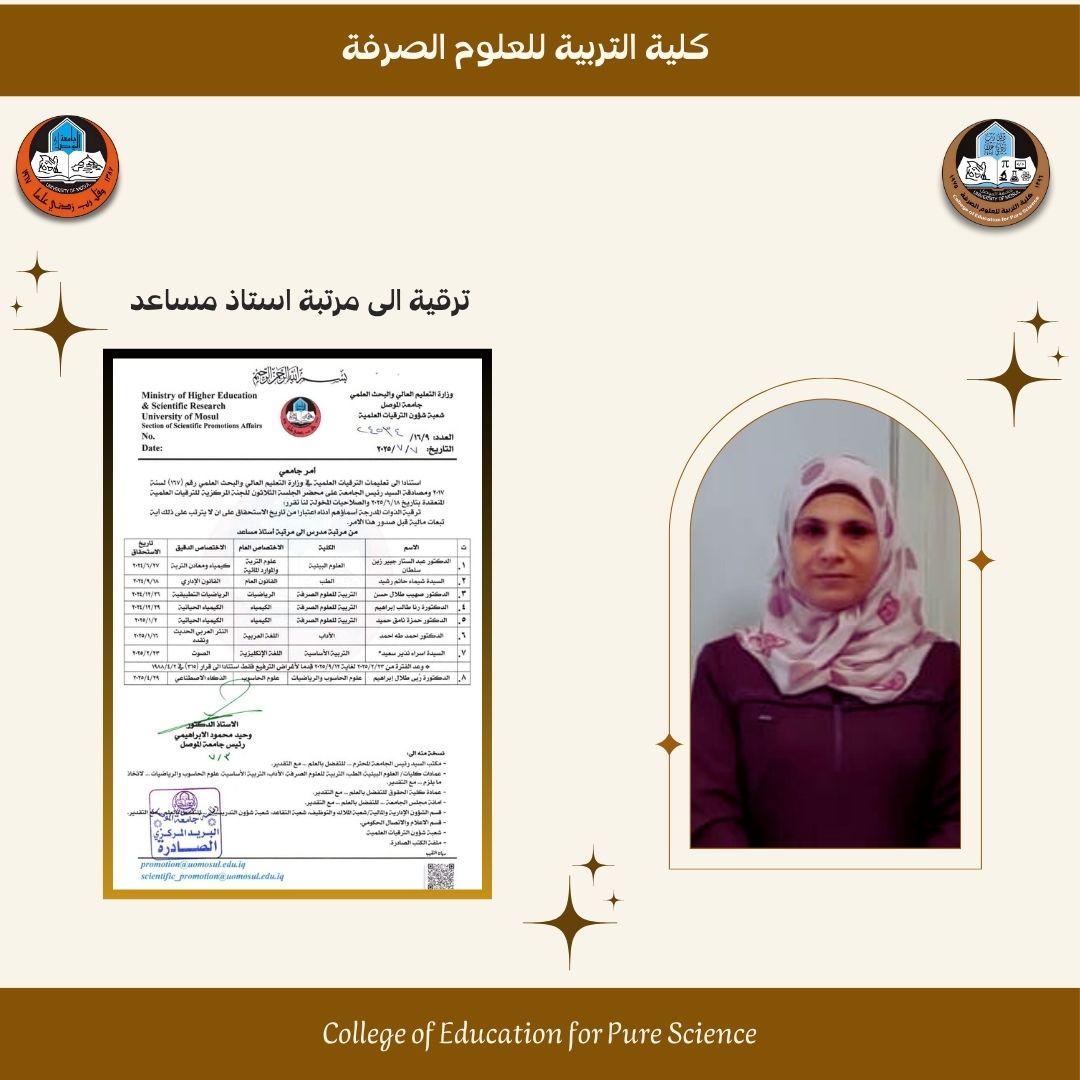 The Deanship of the College of Education for Pure Science, represented by its esteemed Dean, Assistant Professor Dr. Jassim Fatehi Ali, extends its sincere congratulations to Dr. Rana Talib Ibrahim on her promotion from Lecturer [Read More]