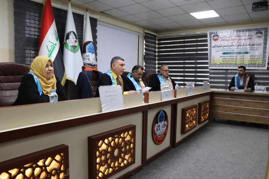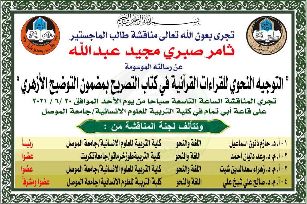 (Grammatical guidance of Qur’anic readings in Al-Azhari’s book “The Declaration of Clarification Content” by Al-Azhari)The Department of Arabic Language at the College of Education for Humanities at the University of Mosul discussed a master’s thesis on grammatical guidance for Qur’anic readings in Al-Azhar.On 20/6/2021,the thesis was submittelhy by the student Thamer Sabri Majid Abdullah in the Department of Arabic Language dealt with directing the Quranic readings contained in the book of declaration with the content of the clarification.The study dealt with the study of what was mentioned by Sheikh Khaled al-Azhari (d. 905 AH) regarding the guidance of the Qur’anic readings contained in his book. around. Chaired by :-Prof. Dr. Hazem Thanoun IsmailAnd the membership of each Assistant Professor Dr. Waad Delian Ahmed, and Assistant Professor Dr. Zahra Saad Eddin Sheet,And under the supervision and membership of AssistantProfessor Dr. Saleh Ali Sheikh Ali