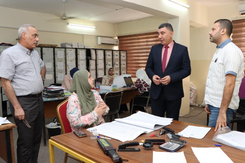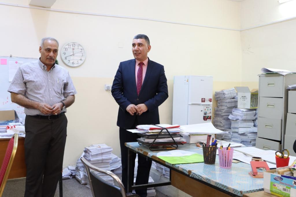 The Dean of the College of Education for Humanities; Prof. Dr. Hazim Thanon Ismael Al-Sabawi accompanied by the head of the English Department; Asst. Prof. Dr. Ismail Fathi Hussein visited the Examination and Audit Committee, to review and directly supervise their work and to stand up to the latest developments regarding the correction and auditing of examination books. The circumstances that may pass them, bearing the trouble of working to ensure the accuracy and speed of work. The Dean recommended the members of the committees to focus, precise in the correction process as well as to be careful in evaluating the answers of dear students to ensure that everyone is given his right. Besides, the members of the examination committee took the chance to thank the Dean for his follow-up and care for the scientific departments, wishing him and all the college cadres and the students success.