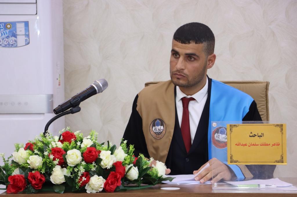 , part of it was attended by Prof. Dr. Hazim thannoon Ismail Al-Sabawi, Dean of the College and a number of the college members. The letter was submitted by the student (dhahir Mutlaq Salman Al-llwayzi).The study dealt with introducing students to the concept of the social self, its role in developing their personalities and its significant impact on the development of proper interaction and social roles among students, providing students with acceptable behaviors and social skills, promoting a positive outlook towards their social self, and revealing the causes and factors that lead to rebellion against family or community authority or school.