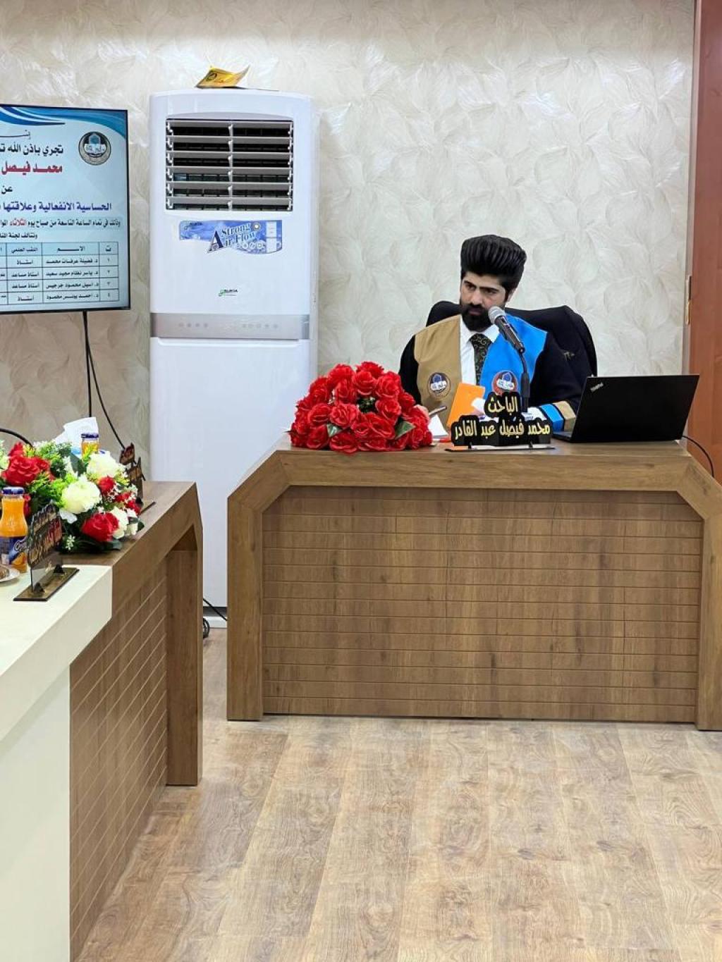 (Emotional sensitivity and its relationship to counter-attraction among students of the University of Mosul). Part of it was attended by Prof. Dr. Hazim Dhannoon Ismail Al-Sabawi, the Dean of the College, and a number of College members.