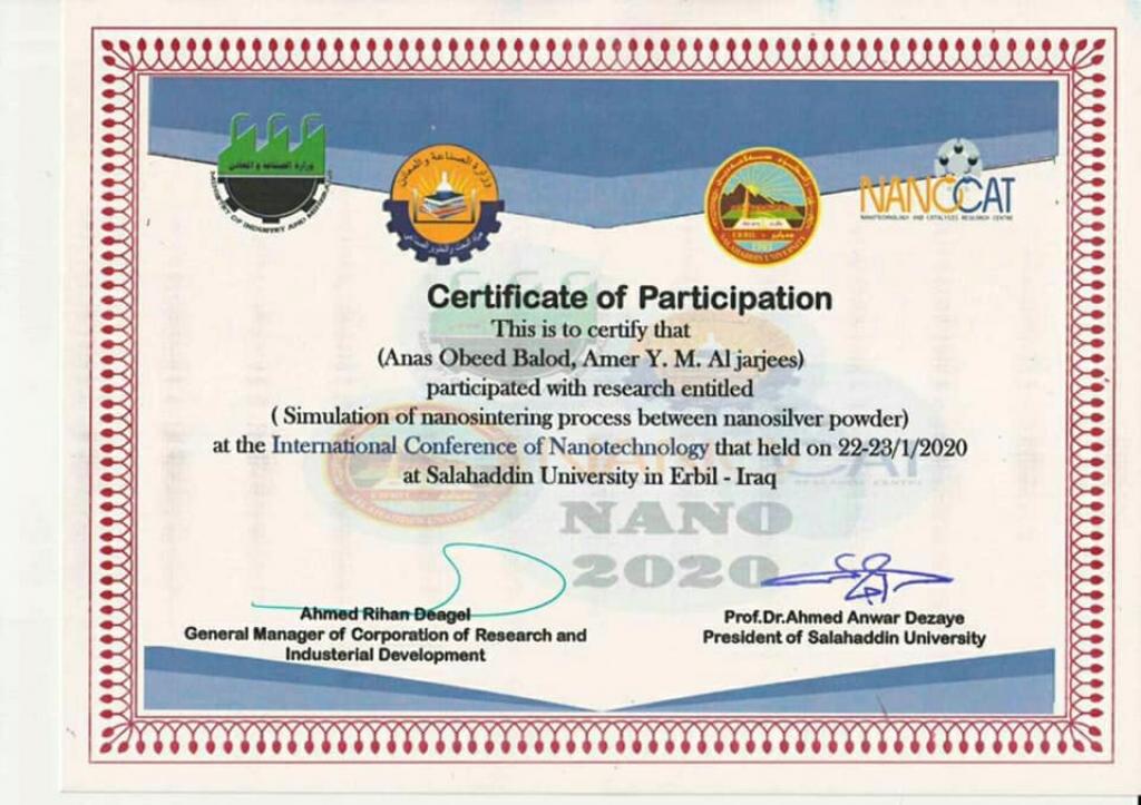 A group of lecturers from Mechanical Engineering Department represented by :1- Asst.Prof. Amer Yahya Al-Jarjees.2- Dr. Anas Obeed Balod.3- Dr. Ziad Shakeeb Al-Sarraf.participated in the international conference on Nanotechnology and its applications