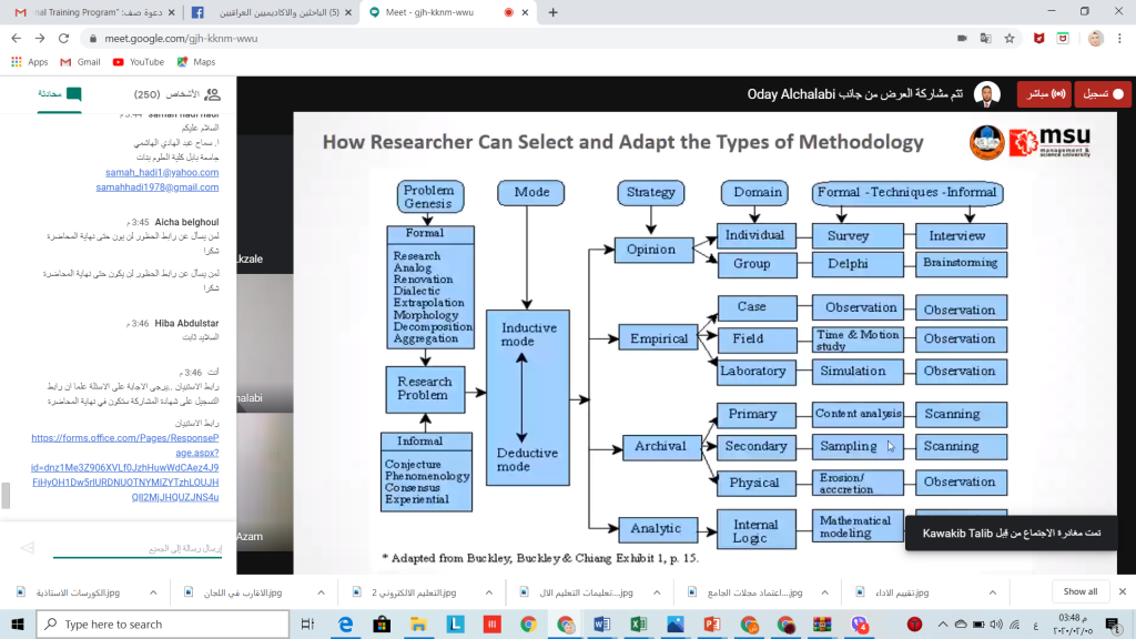 Under the patronage of the Rector of Mosul University Prof. Dr. Kossay Kamalaldeen Al-Ahmady and with the support of Dean of college of Engineering Prof. Dr. Bayar Jaafar Al-Sulayvani, College of Engineering held a joint international training courses between Mosul University & MSU University / Malaysia,entitled ” Can I choose methodology to do my research? ” delivered by dr. Oday Qusay AbdulQadir Al-Chalabi from University of Mosul in addition to a group of lecturers from Management and Science University (MSU)/Malaysia,Dr.JacqulineTham, Dr. S. M.FerdousAzam, and Dr.AhmedAlbattat at 3:30 p.m. in Iraq time – 8:30 p.m. In Malaysia time on Saturday, 2/5/2020 by using the interactive program “Meet”.The course includes how to learn the appropriate methodology, methods for collecting appropriate information, and methods for analyzing digital, written, video and audio data.The workshop was attended by a large number of researchers and academics from various Iraqi and international universities. The lecturers from the MSU University have praised the interest of Iraqi universities to communicate with theuniversities of theworld, as well as organizing and preparing for these courses andinternational workshop also pointed to the importance of thesession to support scientific research and postgraduate studies in Iraq and openness to other universities and show their willingness to further cooperation aswell asto offer seats for thestudy ofPH.D and MS.C all disciplines and deduct a special wage 20%.