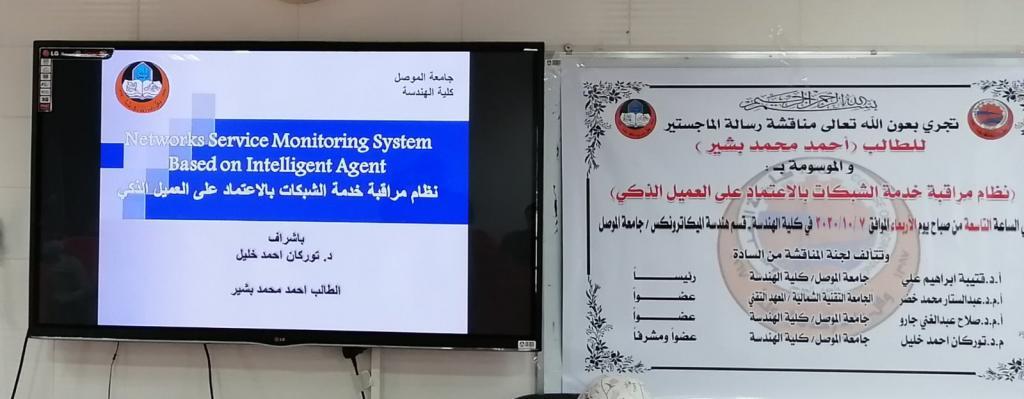 A master thesis was discussed in Computer Engineering Department /college of Engineering at University ofMosul on ( Networks Service Monitoring System based on Intelligent Agent ) for thestudent (Ahmed Mohammed Bashir) on Wednesday 07/10/2020 .