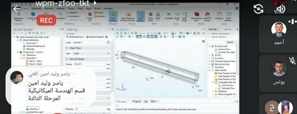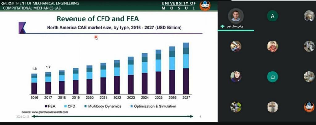 Department of Mechanical Engineering at College of Engineering held a workshop titled “Application of COMSOLMultiphysics” on Tuesday,Feb 23, 2021 presented online via (Google Meet) platform.The workshop included three lectures (COMSOL Multiphysics Applications) presented ByDr. Younis Mahal Najim, (Conjugate Heat Transfer Analysis) presented by Dr. Ahmed Fouad Mahmood, and (Simulation of Composite Sheet) presented by Dr. Anas Obeed Idrees.The workshop was attended by many Lecturers and students from university of Mosul.