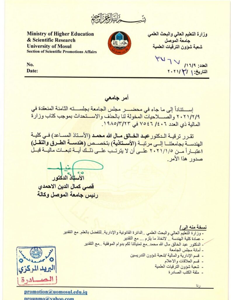 It is worth noting that the Research is a joint collaboration between College of Dentistry and Department of Mechanical Engineering at University of Mosul, completed by Dr. Lamiaa A Hassan (College of Dentistry), Dr. Sarmad S. Salih Al-Qassar (College of Dentistry), Dr. Mohammad N. Al-Rawi (Department of Mechanical Engineering), and Eng. Emad H. Al-Hajar (Department of Mechanical Engineering).