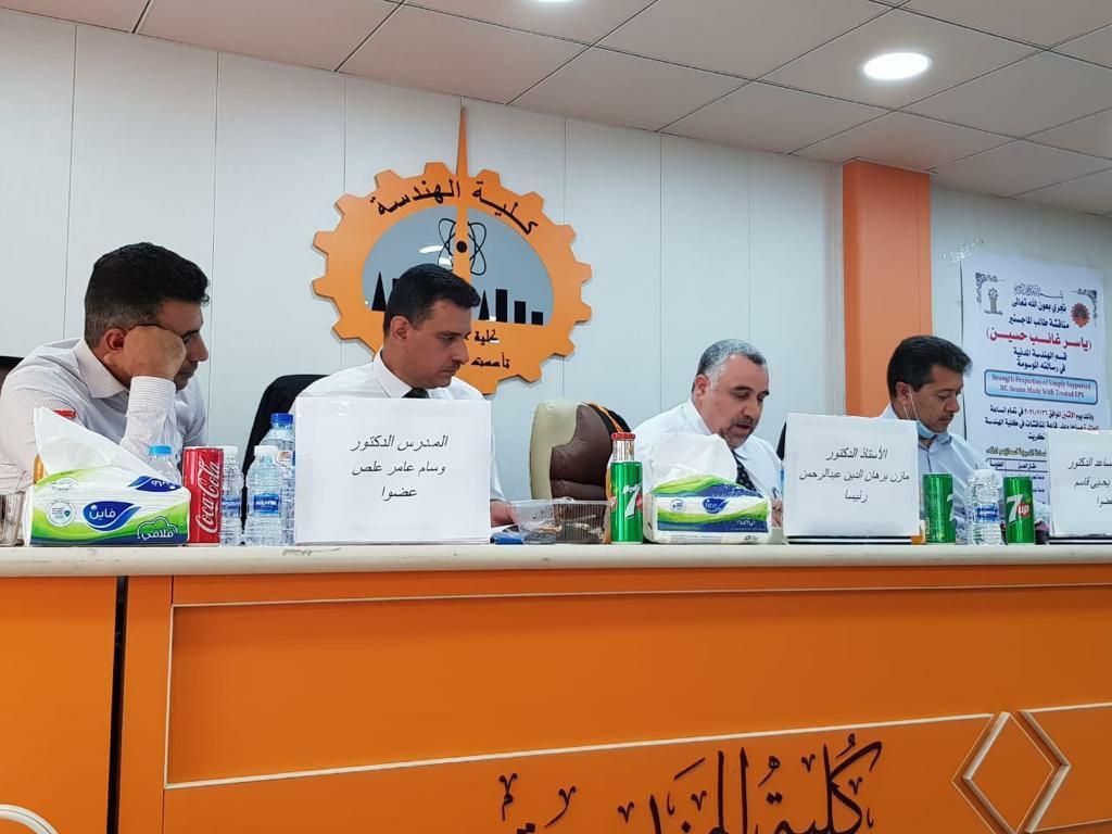 Within the framework of the scientific cooperation of College of Engineering at University of Mosul with other Iraqi universities, the faculty member in Civil Engineering Department, Assist. Prof. Dr. Suhaib Yahya Qasim participated in Master’s thesis viva on Monday, July 26, 2021 Submitted by postgraduate student (Yasser Ghaeb Hussein) in the field of Construction Engineering to Department of Civil Engineering at college of Engineering / University of Tikrit entitled (Strength properties of Simply Supported RC Beams made with treated EPS).