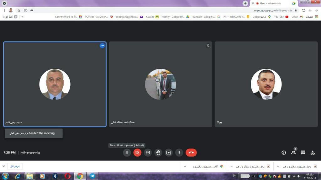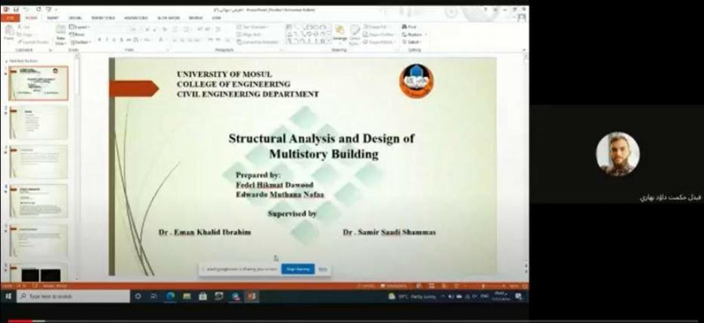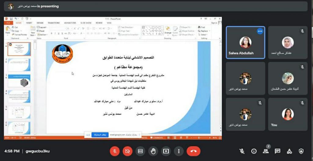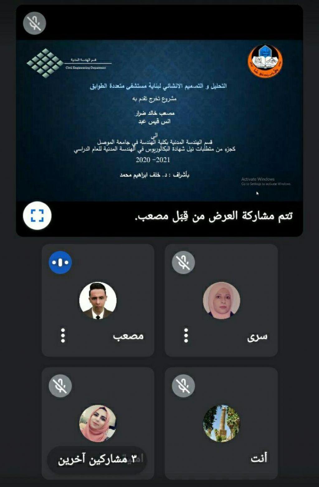 On Thursday, Aug 5, 2021, the final discussion of the graduation projects for the 4th stage students at Department of Civil Engineering held via (Google Meet) platform. Where the students made a detailed presentation that addressed the titles and paragraphs of their projects for the committees that were formed from the department’s lecturers in all civil engineering majors represented in Structure Engineering, Soil and Foundation Engineering, Highway and Transportation Engineering.