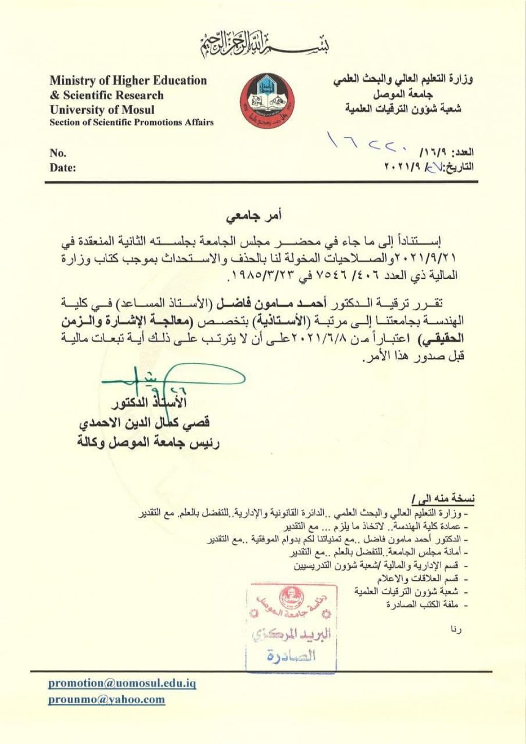 Assistant Prof. Dr. Ahmed Mamoon Fadhil, a faculty member in Department of Computer Engineering / College of Engineering at University of Mosul was promoted to (Professor) Rank in speciality of (Signal processing and real-time) from June. 8, 2021.College of Engineering’s Members congratulate Dr. Ahmed Mamoon for the promotion and wish him more scientific brilliance.