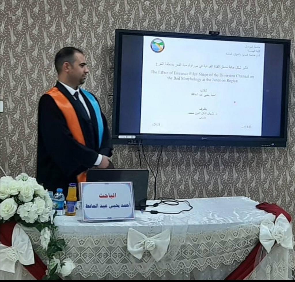 A master’s thesis was discussed in Department of Dams and Water Resources Engineering / College of Engineering at University of Mosul entitled “The Effect of Entrance Edge Shape of the Diversion Channel on the Bed Morphology at the Junction Region” on Monday, Nov. 01, 2021 submitted by postgraduate student (Ahmed Yahya Abdalhafedh) and Supervised By Dr. Nashwan Kamal Aldeen Mohammed.The thesis included investigation the effect of changing the edge shape of the diversion channel entrance from sharp to round (one edge or both) on the bed morphology and dividing streamlines. The investigation considered five different diversion discharge ratios (Qr) (between 7.5% and 30%) and five different rounded edge diameters (between 6 cm and 18 cm).The results indicated that is a direct relationship between the scour depth to diversion channel bed width (ds/Bb) and (Qr). In general, changing one edge shape or both from sharp to round shows a reduction in scouring when Qr is more than about 20%. In all cases, the largest decrease value of (ds/Bb) was (22%). The entrance shape model with a rounded edge at the upstream recorded outperforming other models in scour reduction. This model shows a reduction in the volume of a scour hole in all cases of Qr and rounded edge diameter with reduction values up to 53.25%. The results also indicate an inverse relationship between (ds/Bb) and the Froude number of the downstream main channel and a direct relationship to the Froude number of the diversion channel. Empirical equations were derived to estimate (ds/Bb) with mean absolute percentage error (MAPE) not exceeded 7.737% for different models.The entrance shape model with rounded edges recorded outperforming other models in a diversion channel sedimentation reduction and in the enhancement of dividing streamlines behavior. However, the entrance shape model with a rounded edge at the downstream recorded outperforming other models in a main channel sedimentation reduction with a reduction value up to 68.3%. The outcomes from this study indicate that is the entrance shape of the diversion channel can be enhanced by modifying the edge or edges of the entrance from sharp to round. This modification contributes to improved bed morphology and uniformity of the dividing streamlines in the junction region.