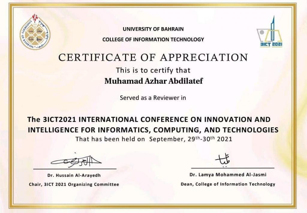 Within the scientific activities of Mechatronics Engineering Department’s Members, the lecturer Mr. Muhamad Azhar Abdilatef Al-Obaidy was selected as Reviewer for the scientific research to accept it for publication in “International Journal of Engineering and Digital Systems,” a journal of University of Bahrain that is classified in Scopus and Elsevier.It is noteworthy that the selection of Mr. Muhamad Azhar as a permanent reviewer for the journal was the result of his scientific efforts by following up and evaluating the research submitted to participate in EDAS, DATA’21 and 3ICT2021 conferences, which were sponsored by the same university.