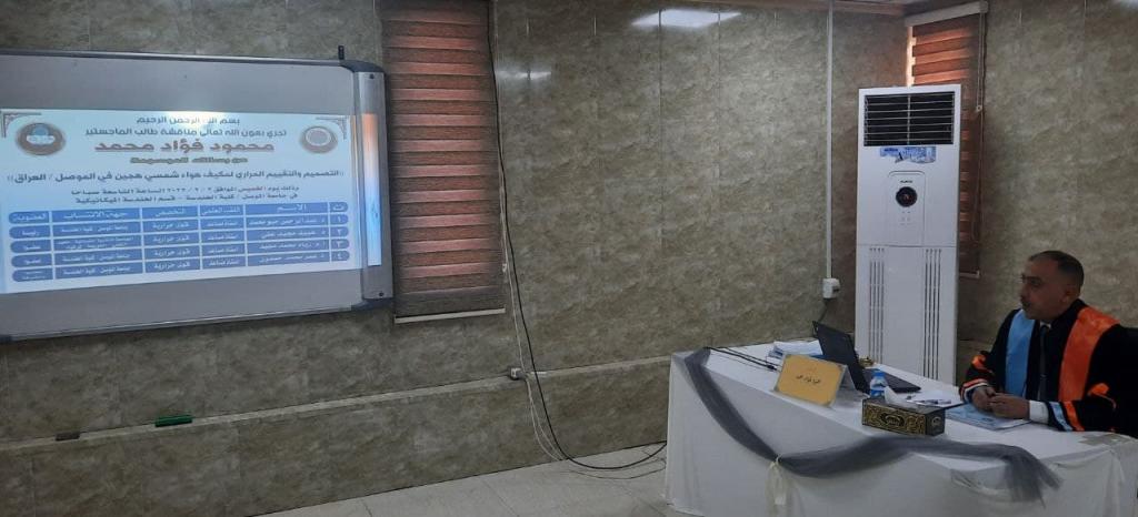 A master thesis was discussed in Department of Mechanical Engineering / College of Engineering / University of Mosul entitled “Design and thermal evaluation of hybrid split air conditioner in Mosul/Iraq” submitted by postgraduate student (Mahmoud F. Mohammed), Supervised ByAssist. Prof. Dr. Omar M. Hamdoonon Thursday, Feb. 03, 2022.The thesis conducted an experimental study to study the improvement of the coefficient of performance of a hybrid solar air conditioner and compare it with the performance of a conventional air conditioner. In addition to studying the rate of electrical energy saving for the hybrid system. The study included the study of the factors and variables affecting the performance of the hybrid solar air conditioner during three continuous months (June, July, and August); From intensity of the solar radiation, and the environment temperature.The hybrid solar air conditioner consisted of a conventional split air conditioner with cooling capacity (12,000 BTU/h – 3.5 KW) and a variable speed compressor integrated with a solar collector. The solar collector consisted of a flat solar panel combined with a hot water storage tank. Inside the tank there is a copper coil heat exchanger, inside which the refrigerant leaving the compressor of the hybrid solar air conditioner passes. Two solenoid valves were installed to control the flow direction of the refrigerant leaving the compressor either to solar heat exchanger and then to the condenser or directly to the condenser.The results of the experimental showed that the heat added to the refrigerant while it was passing through the solar heat exchanger increased its kinetic energy and temperature, and thus maximized the amount of heat expelled by the condenser, which led to an increase in the subcooling of the refrigerant leaving the condenser, as well as an increase in the cooling effect of the evaporator and thus controlling the temperature of the test room more efficiently compared to a conventional air conditioner.The electrical energy saving rate was found, in addition to calculating the amount of enthalpy for each point of the conventional and hybrid refrigeration cycle using computer program engineering equations solver (EES) based on the temperature and pressure data read, and then calculating the coefficient of performance (COP) for the three systems (conventional air conditioner, hybrid solar air conditioner without refrigerant flow direction – first case, hybrid solar air conditioner with refrigerant flow direction control – second case). The results proved that the highest improvement in the coefficient of performance of the solar hybrid air conditioner – the first and second cases is (12.2% – 16.3%) compared to the performance factor of the conventional air conditioner, and that the highest rate of electrical energy saving for the solar hybrid air conditioner – the first and second cases is (15.9% – 18.7%) compared to a conventional air conditioner.