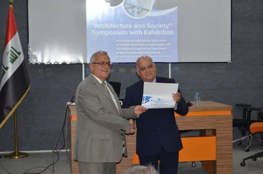 A group of Lecturers from Department of Architecture Engineering participated in symposium on “Architecture and Society” held by the Catholic University in Erbil, which was opened and attended by Dr. Riyadh Francis (President of the Catholic University), and a group of professors of Iraqi architecture, including Prof. Mahmood Baker Khayyat, Prof. Butrus Khamo and Prof. Jinan Khamo.Assist. Prof Miqdam Amin (Head of Department of Architecture Engineering at the University of Mosul), presented the opening research which dealt with the theorists’ proposals about the determinants of the relationship of mutual influence between architecture and society. In addition to the participation of Dr. Khawla Fayyad Mahmood, Dr. Basam Al-Hafidh, Mr. Ashraf Hafoudhi, Mrs. Maysaa Mowafaq and Mrs. Rawya Dabdoob with a number of research papers which highlighted many problems related to the architecture, society and proposed solutions.The President of the Catholic University wished this meeting to be the beginning of scientific cooperation between the two departments of architecture at University of Mosul and the Catholic University.
