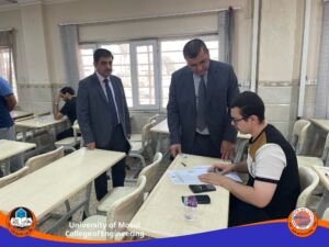 On the first day of the examinations, Dean of the College, Assistant Professor Dr. Omar Mohammed Hamdoon, accompanied by the Assistant Dean for Scientific Affairs, Assistant Professor Dr. Ayman Talib Hameed, inspected the examination halls.