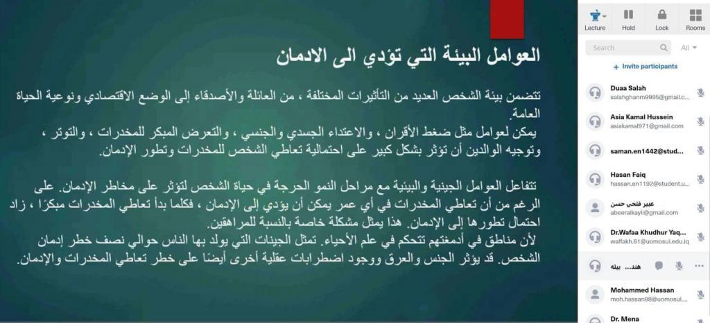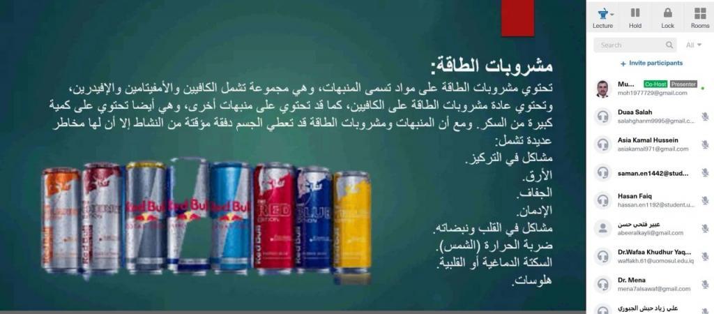 Within the awareness lectures that are part of the scientific efforts to provide people with adequate psychological immunity to prevent the dangers of inappropiate and harmful behaviours for their abusers, Dr. Mohammed Abdul Ghafour Al-Qattan (Assistant Prof. in Biochemistry Branch / College of Medicine at University of Nineveh) gave a lecture entitled “Drugs and Stimulants” on Saturday, March 13th, 2021 via (FCC Conference) platform, directed to College of Engineering’s students to raise awareness of the danger of addiction in general, which it defined as Painkillers, Stimulants, and Hallucinogens.He said that among the causes of addiction comes first bad friends and then frustrating the school or family or a person accustomed to relieve pain, and to identify the general symptoms of addictionhas identifieddepressionand strange reactions indicating that the effect of addiction:appears in reducing proteins production, increased stimulation for cancers, depression, frustration and other, even stimulus to think about committing suicide, as well as irreversible genetic changes even with addiction recovery.He concluded his lecture by indicating that sports Stimulants including Creatine and Energy Drinks are so dangerous taken without right consultation.
