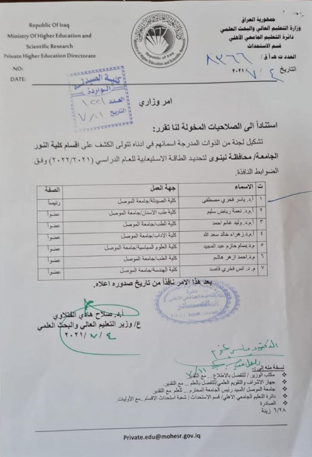 The ministerial committee, consisting of a group of Mosul University lecturers, visited Al-Noor University College to determine the capacity of its eleven departments. Where Dr. Anas Fakhry from (Department of Environmental Engineering) participated in the committee’s membership. The meeting was followed by the committee’s visit to all the classrooms, scientific laboratories and other service facilities of the college. It is noteworthy that this visit will be followed by successive visits to accomplish the task entrusted to the committee.