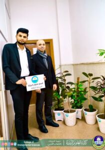 In implementation of the directives of the Dean of the Faculty of Environmental Sciences, Dr. Yusra Majeed Al-Shaker, and under the supervision of the Head of the Environmental Sciences Department, Dr. Muhammad Ibrahim Khalil, the third-year students in the Environmental Sciences Department took the initiative today, Wednesday, December 11, 2024, to decorate the corridors of the department with shade plants due to their great importance in purifying the air and creating beautiful spaces inside the college.