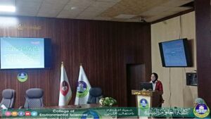 Under the patronage of the Dean of the College of Environmental Sciences, Dr. Yusra Majeed Al-Shaker, and under the supervision and attendance of the Head of the Department of Environmental Sciences, Dr. Muhammad Ibrahim Khalil, and within the series of seminars for graduate students in the Department of Environmental Sciences, two seminars were held in the department on Wednesday, December 18, 2024, in the college discussion hall. The first was given by master’s student Barda Abdul Qader entitled “The role of poultry waste in developing the next generation of super fertilizers as environmentally friendly agriculture”, and the second was given by master’s student Amna Qutaiba entitled “A study to improve the analysis of radioactive contamination levels in the wild vegetation cover of Nineveh Governorate as an indicator of environmental pollution”.