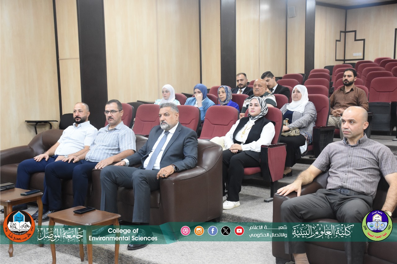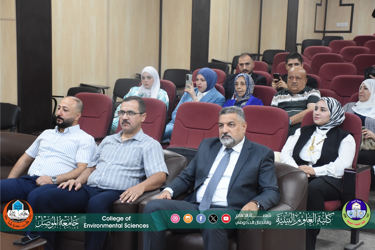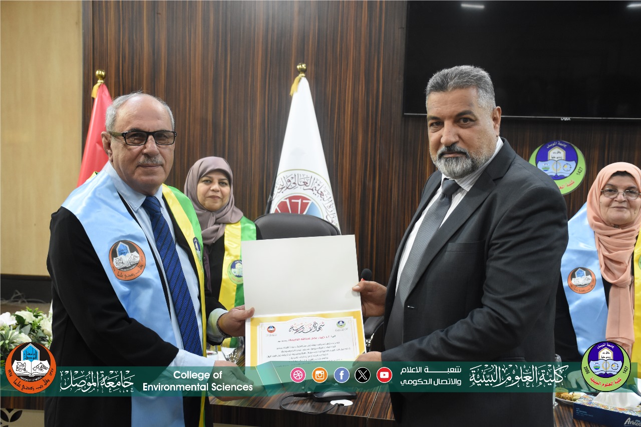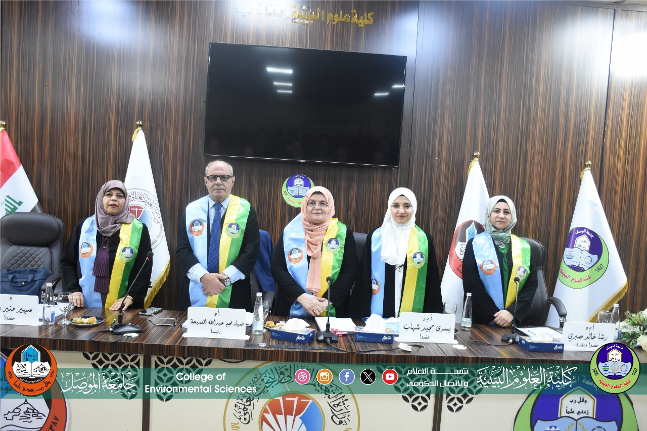 Under the patronage of the President of the University of Mosul, Professor Dr. Wahid Mahmoud Al-Ibrahimi, and in the presence of the Dean of the College, Professor Dr. Muthanna Jassim Al-Taie, the Dean’s Assistants for Scientific and Administrative Affairs, and the Head of the Department of Environmental Sciences, the Master’s thesis defense, titled “Photocatalytic Degradation of Microplastics in Aqueous Solution Using Nano-Catalysts,” was held this morning, Sunday, August 24, 2025, in the discussion hall of our college.