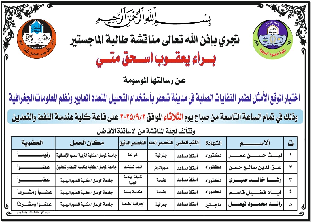 God willing, the master’s thesis of student Baraa Yaqoub Ishaq Matti will be discussed. Her thesis is entitled “Choosing the optimal site for solid waste burial in the city of Tal Afar using multi-criteria analysis and geographic information systems.” The discussion will take place at nine o’clock in the morning on Tuesday, September 2, 2025, in the hall of the College of Petroleum and Mining Engineering.