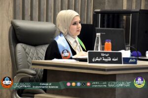 Under the patronage of the President of the University of Mosul, Professor Dr. Wahid Mahmoud Al-Ibrahimi, and in the presence of the Dean of the College of Environmental Sciences, Professor Dr. Muthanna Jassim Al-Taie, and accompanied by the Assistant Dean for Administrative Affairs, Dr. Omar Idris Saleh Al-Maamari, the Master’s thesis defense in the Department of Environmental Sciences, entitled “Analysis of Radioactive Pollution Levels in the Terrestrial Vegetation Cover of Nineveh Governorate as an Indicator of Environmental Pollution,” was held this morning, Tuesday, September 9, 2025, in the discussion hall of the College of Petroleum and Mining Engineering. The thesis, presented by student Amna Qutaiba Muslim Al-Bakri, was held in the Department of Environmental Sciences. The defense was held in the discussion hall of the College of Petroleum and Mining Engineering.