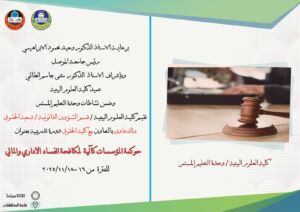 Under the patronage of Professor Dr. Waheed Mahmoud Al-Ibrahimi, President of the University of Mosul, and the supervision of Professor Dr. Muthanna Jassim Al-Tai, Dean of the College of Environmental Sciences, and as part of the activities of the Continuing Education Unit to contribute to raising and developing the skills of staff in government departments, the College of Environmental Sciences/Department of Legal Affairs/Rights and Litigation Division, in cooperation with the College of Law at the University of Mosul, is holding a training course entitled “Institutional Governance as a Mechanism for Combating Administrative and Financial Corruption.” The course will be held over three days, from November 16th to 18th, 2025, at 10:00 AM in the College’s discussion hall.