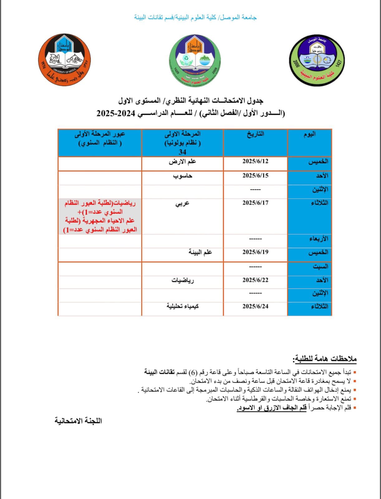 Department of Environmental Technologies / Final Exam Schedule 2024-2024