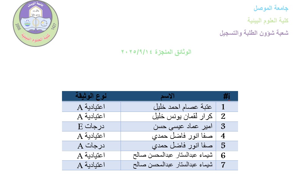 The documents were completed at the Student Affairs and Registration Department as shown in the table below. September 21 , 2025 University of Mosul / Sustainable University Department of Media and Government Communication #College_of_Environmental_Sciences
