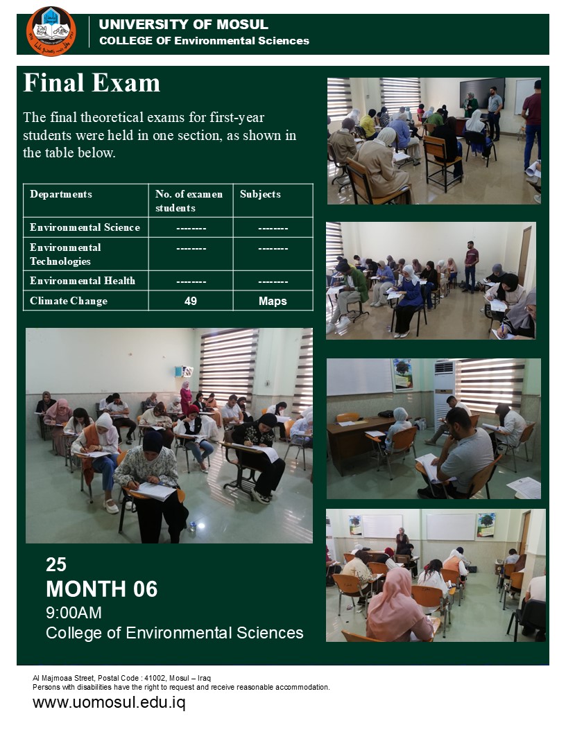 The final exam schedule for the College of Environmental Sciences is Tuesday, June 17, 2025. University of Mosul (UOM)/ Sustainable University Department of Media and Government Communication #College_of_Environmental_Sciences