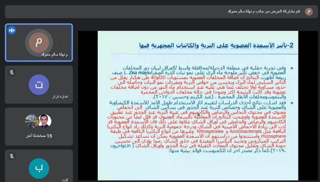 An online workshop has been held at the environment research centre in Mosul University to shed some light on the effect of following organic agriculture on the environment and sustainabile development. The protection of crops from harmful insects and other diseases have been covered by Mrs Nahla Salim Hammock, the lecturer at the environment research centre in the workshop which was started at 8 pm at the evening of Sunday 12th June. The event was conducted using Google meet platform. The event that has been supervised by Dr Saba khairuddeen AlTaee the head of the centre, was attended by many of the faculty members of different educational institutions who are interested in the topic.