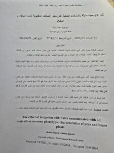 Ms. Reem Nawzat Ahmed, a lecturer at the Environmental Research Center, published a scientific study on the effect of irrigation with water polluted with petroleum derivatives on some phenotypic characteristics of pea and broad bean plants in the Rafidain Environment Journal, published by the University of Mosul.