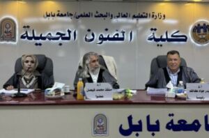 On Sunday, August 17, 2025, Professor Dr. Munqith Mohammed Faisal from the College of Fine Arts at the University of Mosul participated in a master’s thesis defense committee at the College of Fine Arts at the University of Babylon. The student, Ibrahim Abdullah Jabr, presented his thesis titled “The Bauhaus and its workings in the design of contemporary Iraqi theatrical display techniques.”