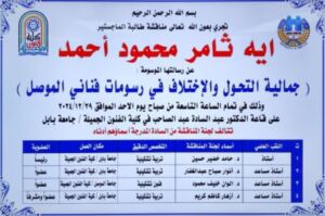 Assistant Professor Dr. Alwan Khalif Mahmoud, a lecturer in the Fine Arts Department at our college, participated today, Sunday, December 29, 2024, in a scientific arbitration committee at the College of Fine Arts, University of Babylon, for student Aya Thamer Mahmoud and her thesis entitled “The Aesthetics of Transformation and Difference in the Drawings of Mosul Artists.” The committee consisted of the individuals listed below: