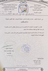 Professor Dr. Hamid Ibrahim Al-Rashidi participated in the scientific arbitration committee for master’s student Muhammad Raad Ahmed and his thesis entitled “The Tragic Character and Its Representations in the Drawings of Nineveh Artists” on Thursday, January 23, 2025. The discussion committee consisted of the following ladies and gentlemen:
