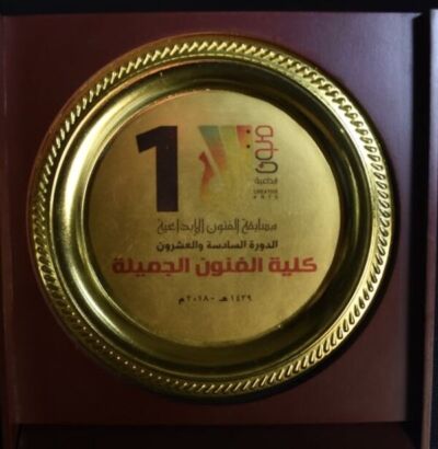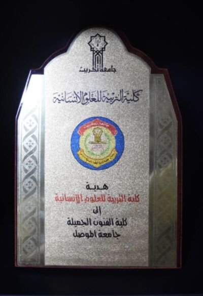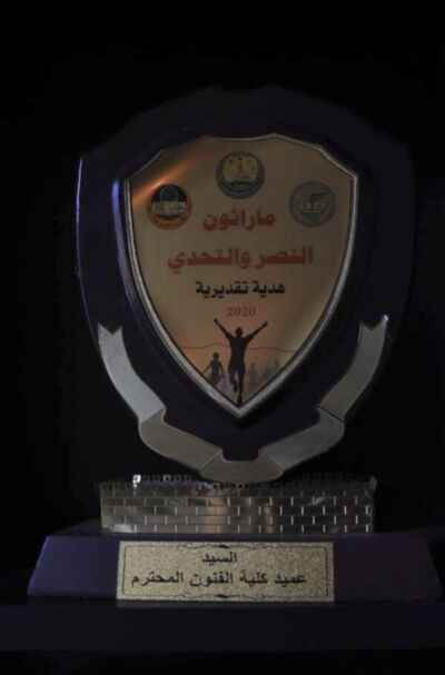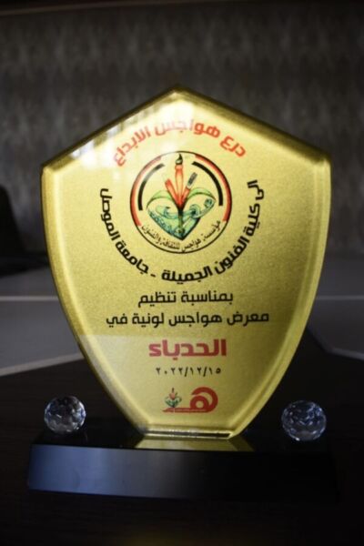 A shield from Hawajes Foundation for Culture and Arts on the occasion of organizing the “Hawajes of Colors in Hadbaa” exhibition.