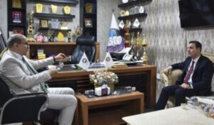 Professor Dr. Hamed Ibrahim Al-Rashedi, Dean of the College of Fine Arts, welcomed Professor Dr. Nashat Mubarak Saliwa, President of Al-Hamdaniya University, today, Monday, August 4, 2025. During the meeting, they discussed joint scientific cooperation between the two parties to serve the educational process.