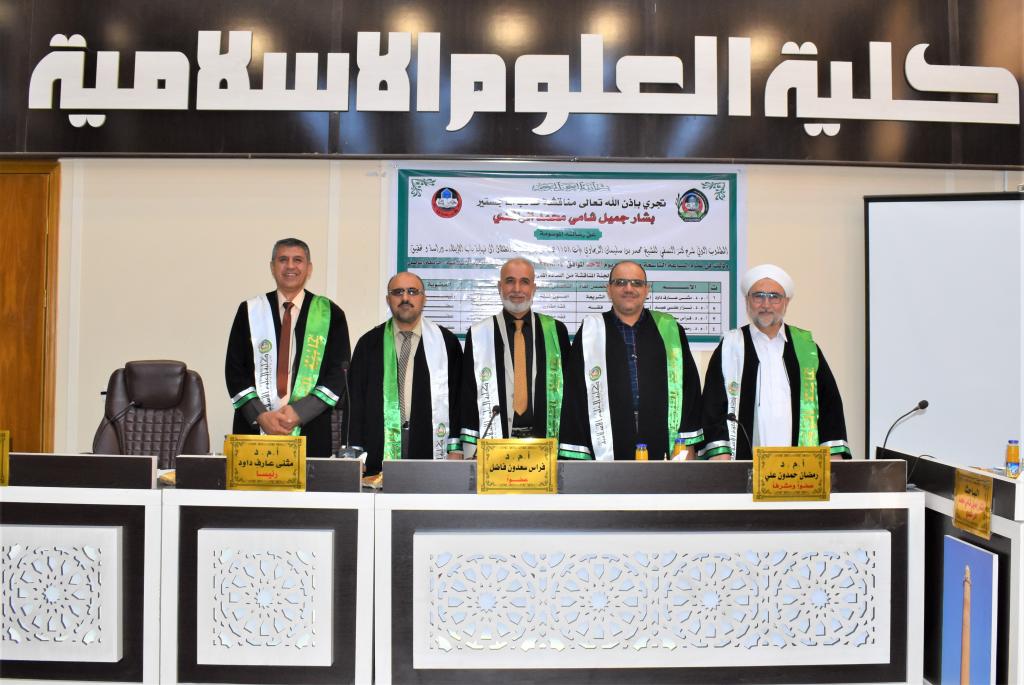 A master thesis was discussed at the Department of Shari’a/ The College of Islamic Sciences at the University of Mosul entitled (Al-Matlub Al-Wafi Sharh Kanz An-Nasafi by Sheikh Muhammad bin Salman Al-Rihawi (d. 1158 AH) From the Beginning of the Book of Divorce to the End of the Chapter on Vow of Continence – Study and Investigation) on Sunday, August 14, 2022, part of which was attended by Prof. Dr. Taha Hammad Mukhlif, Dean of the College, Assistant Professor Dr. Thabet Mahdi Hamadi, Associate Dean for Administrative and Financial Affairs, Assistant Professor Dr. Ahmed Ibrahim Ismail, Head of the Shari’a Department, and a number of the faculty’s staff members.The thesis submitted by the student (Bashar Jamil Shami Muhammad) at the Shari’a Department dealt with the investigation of the manuscript (Al-Matlub Al-Wafi Sharh Kanz An-Nasafi by Sheikh Muhammad bin Salman Al-Rihawi (d. 1158 AH)). The study highlights the manuscript as a resource of help for students of Hanafi jurisprudence because of its importance and as a great addition to the Hanafi library.The panel was chaired by Assistant Professor Dr. Muthanna Aref Daoud and the membership of Assistant Professor Dr. Nizar Ali Abd and Assistant Professor Dr. Firas Saadoun Fadel, and under the supervision and membership of Assistant Professor Dr. Ramadan Hamdoun Ali.