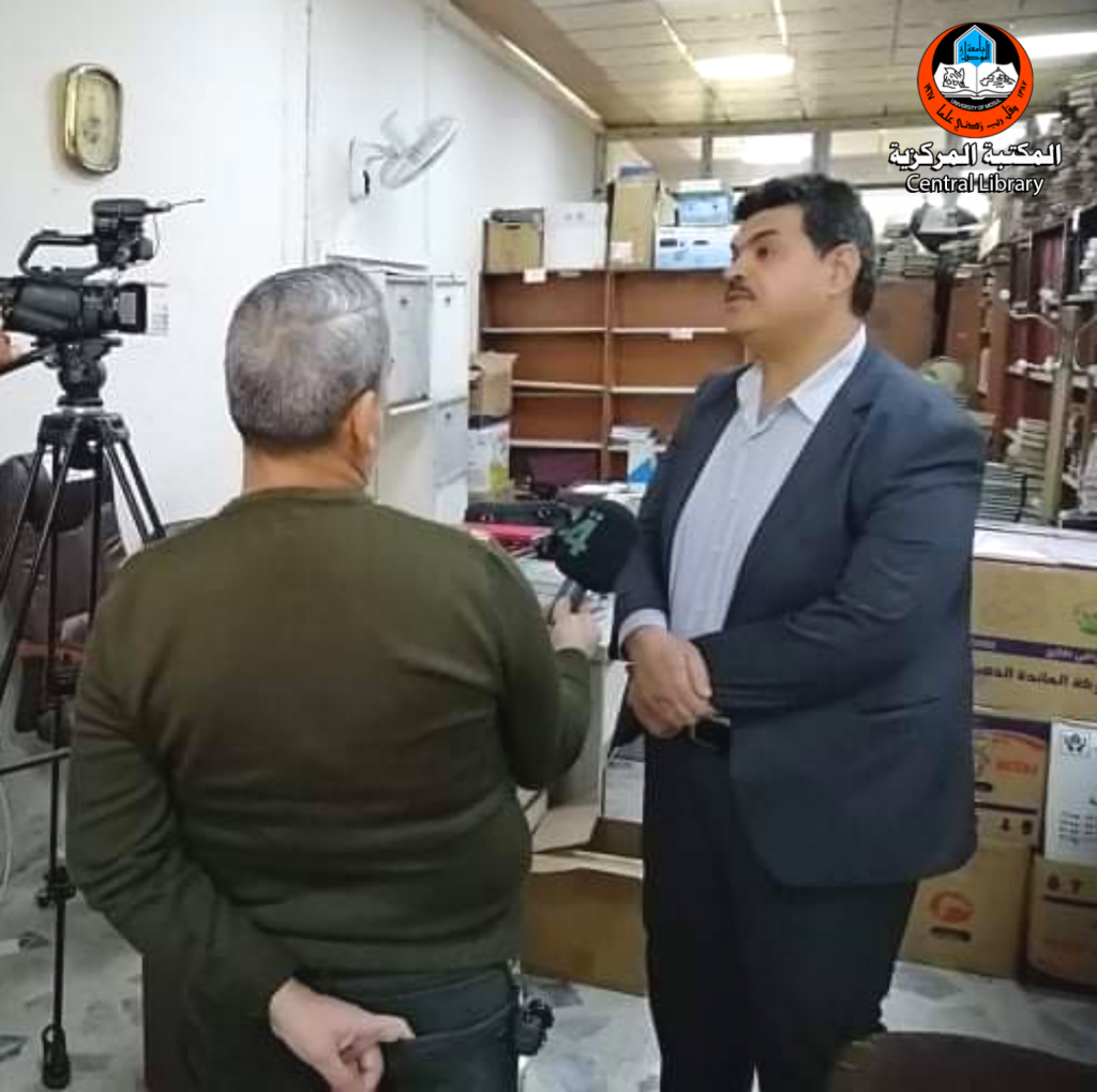 On November 14, 2021, the Secretary-General of the University Libraries, Mr. Sayf Al-Ashqar , and the library staff members received the teams of Al-Rabiaa Iraq and Al-ghadeer TVs, who came to document the stages of the reconstruction of the Central Library. Mr. Sayf provided the TV teams with a full explanation of the Library before and after ISIS and the cultural and scientific role it played and is still playing in the upbringing of generations since its establishment until the present time, mentioning the difficulties and challenges it faced when it was occupied by ISIS, who looted, burned and destroyed it, and how it returned after liberation to its former era as a great cultural and scientific edifice, and the reconstruction of its former building to keep pace with development like advanced global libraries through local, regional and global support. In the end, the TV teams met with some of the library’s users, who expressed their pride in the Library and their happiness in its reconstruction and the return of life to it.