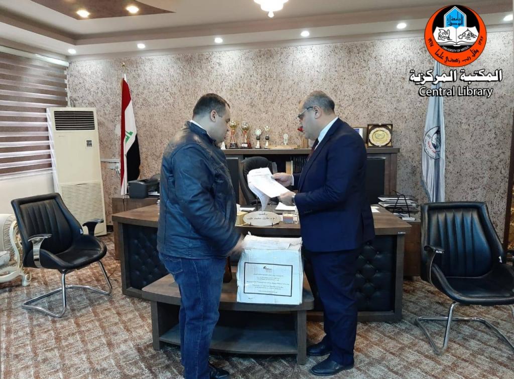 Within the framework of the constant cooperation taking place at the University of Mosul, the Secretary-General of the University Libraries, Mr. Sayf Al-Ashqar, and some of the library technical staff personally delivered books, recently donated to the Central Library by the Ideas Without Borders Organization, to the library of the College of Political Science at the University second campus and viewed at the same time the library workflow there. During the visit, Dr. Tarek Mohammad, Dean of the College of Political Science, expressed his appreciation for these efforts made by the General Secretariat of the University of Mosul Libraries to improve the level of services provided to library users in the colleges’ libraries at the University of Mosul.