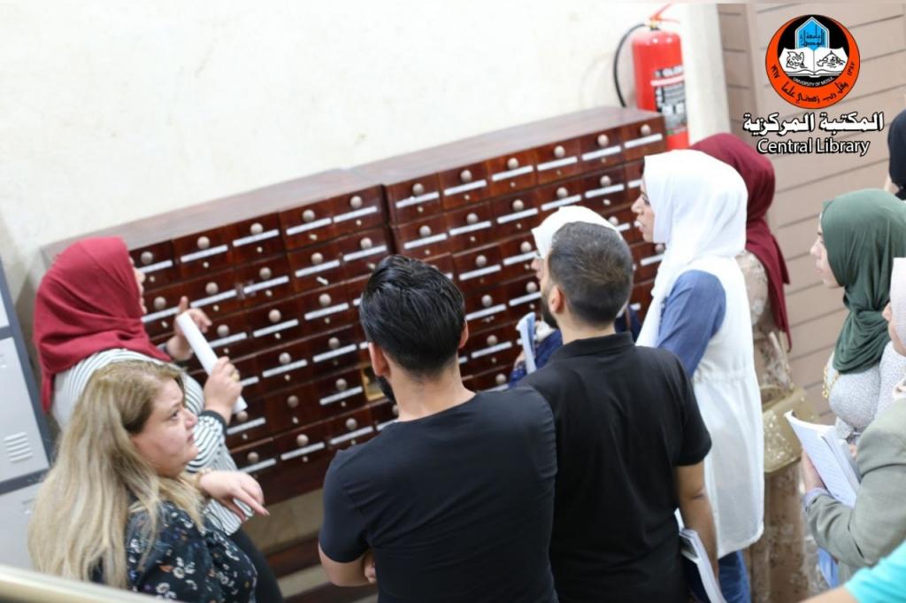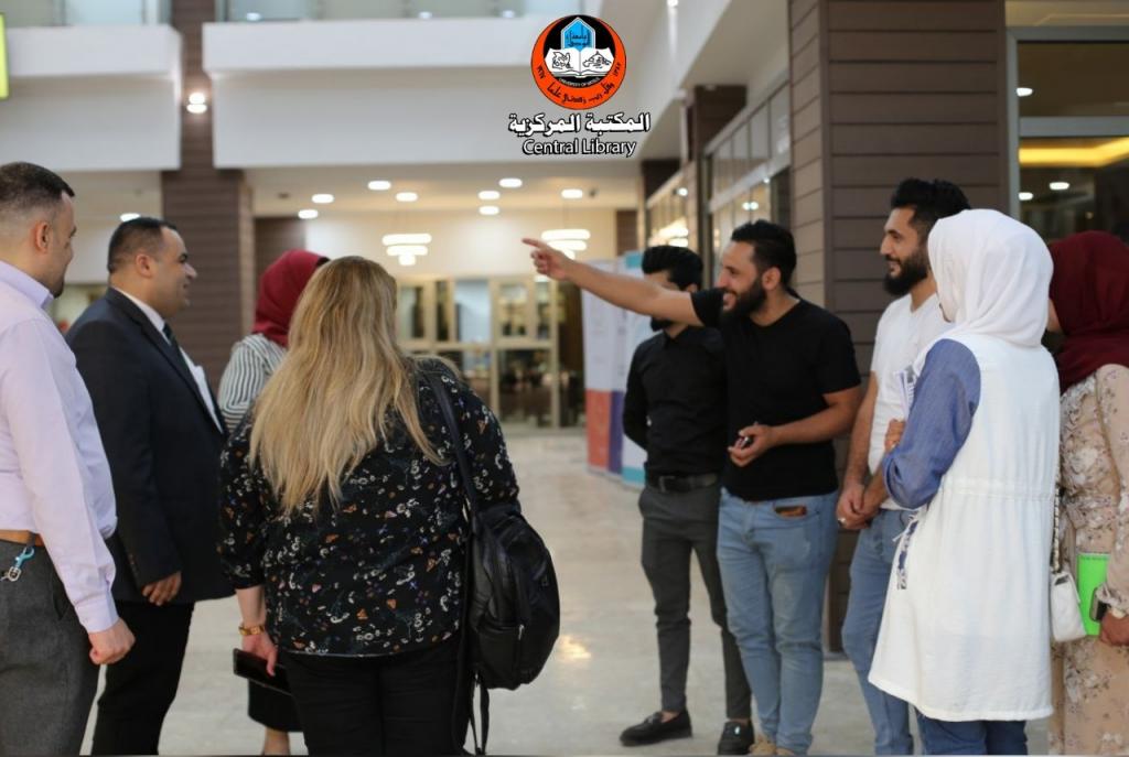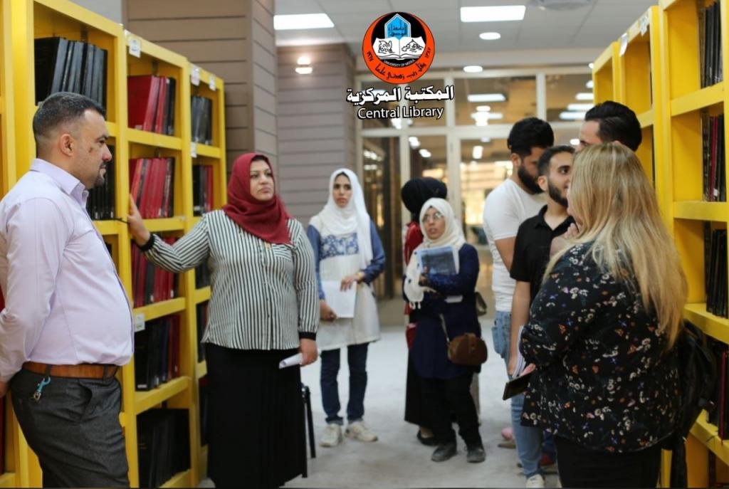 With a follow-up from the General Secretariat of the University Libraries, a group of professors and undergraduates, Department of Information and Knowledge Technologies, College of Arts, University of Mosul, visited the Central Library. Ms. Rafal Alhamandi, Head of the Division of User Services, took them on a tour inside the Library, explaining to them how to borrow books, magazines, periodicals, and the mechanism of library work. The visitors were grateful to the General Secretariat of the University Libraries and the library staff members for their efforts to serve science and culture at the University of Mosul.