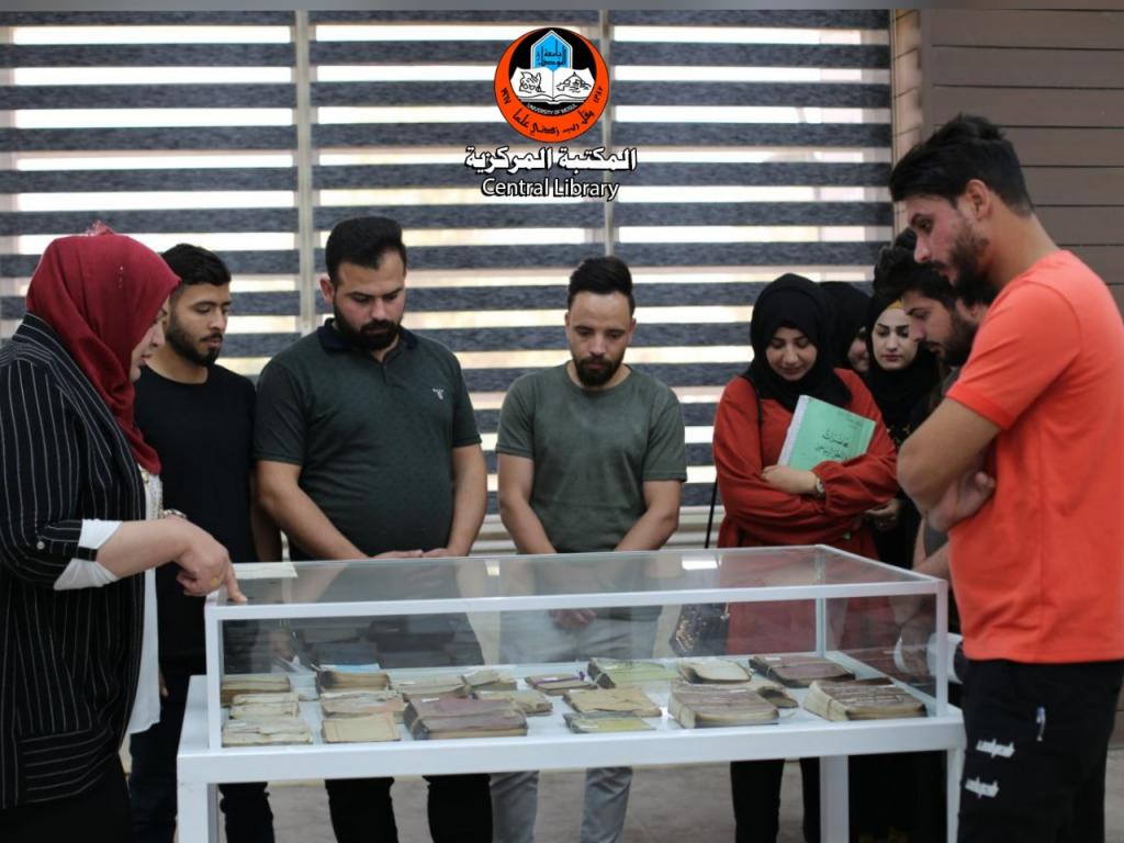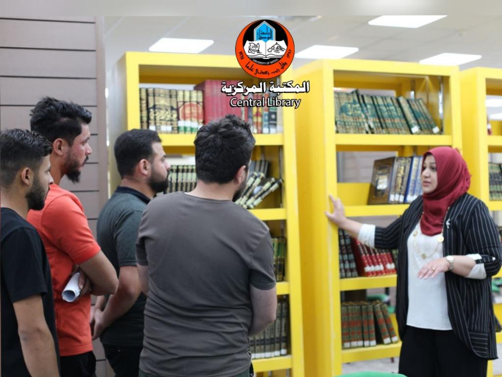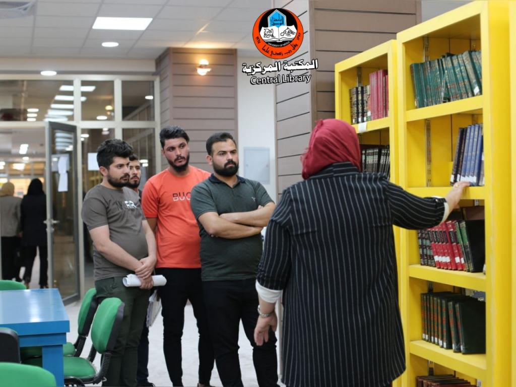 With a follow-up from the General Secretariat of the University Libraries, a group of professors and students of the Department of Philosophy, College of Arts, University of Mosul, visited the Central Library. Ms. Rafal Alhamandi, Head of the Division of User Services, took them on a tour inside the Library, explaining to them how to borrow books, magazines, periodicals, and the mechanism of library work. The visitors were grateful to the General Secretariat of the University Libraries and the library staff members for their efforts to serve library users at the University of Mosul
