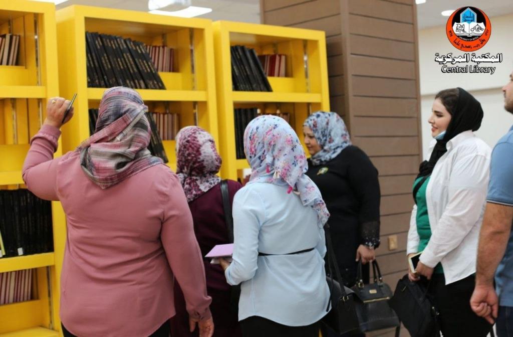With a follow-up from the General Secretariat of the University Libraries, Dr. Wafa Abdullatif Zainul’aabedin and the postgraduates of the Department of English, College of Arts, University of Mosul, visited the Central Library. Ms. Rafal Alhamandi, Head of the Division of User Services, took them on a tour inside the Library, explaining to them how to borrow books, magazines, periodicals, and the mechanism of library work. The visitors were grateful to the General Secretariat of the University Libraries and the library staff members for their efforts to serve library users at the University of Mosul.