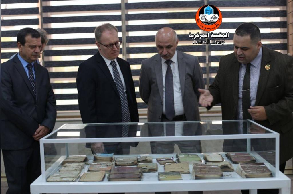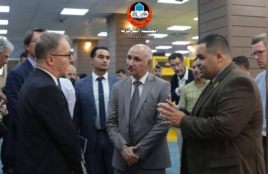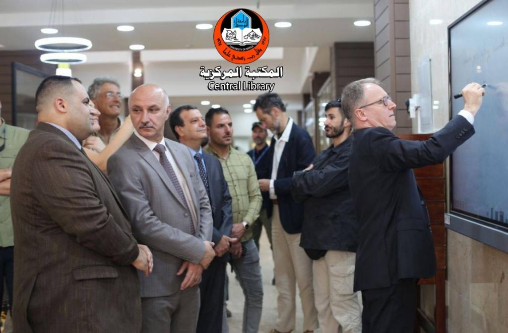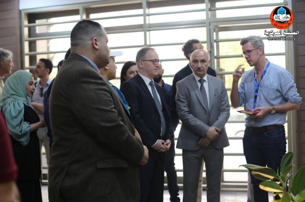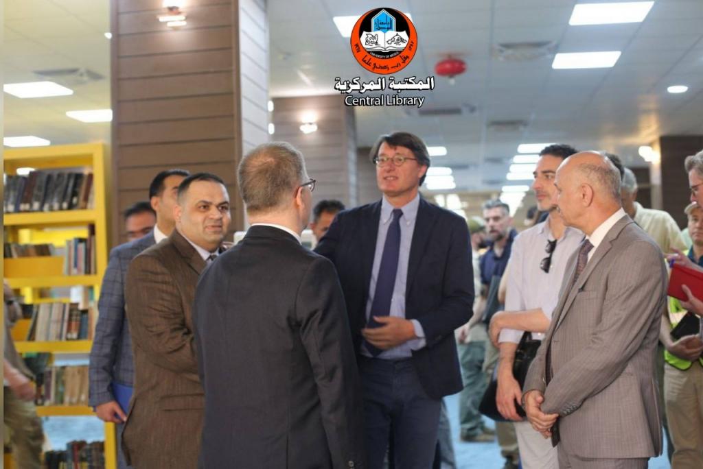 In order to strengthen the bonds of cooperation between Mosul University, headed by Prof. Dr. Kossay Al-Ahmady, and international and local authorities to support the Central Library in the cultural and scientific fields, the University Assistant Rector, Prof. Dr. Wahid Al-Ebrahimi, accompanied by the Dean of the College of Archaeology, the Italian Archeologist Nicola Marceti and a number of administrative officials in the University Presidency, received the Italian Ambassador to Iraq, Maurizio Greganti, who visited the recently constructed Central Library, accompanied by the UNESCO and UNDP delegations. The Secretary General of the University Libraries, Mr. Sayf Al-Ashqar briefed the visitors of the Central Library and its services and the suggested plans set by the University Rector to promote it. The Italian Ambassador expressed his admiration for this achievement, stressing that there will be plans to support the Central Library for its importance in spreading the diverse culture and sciences in the community.