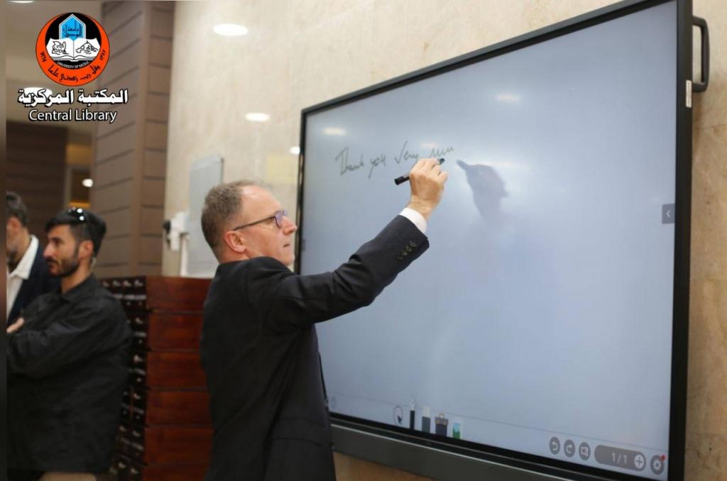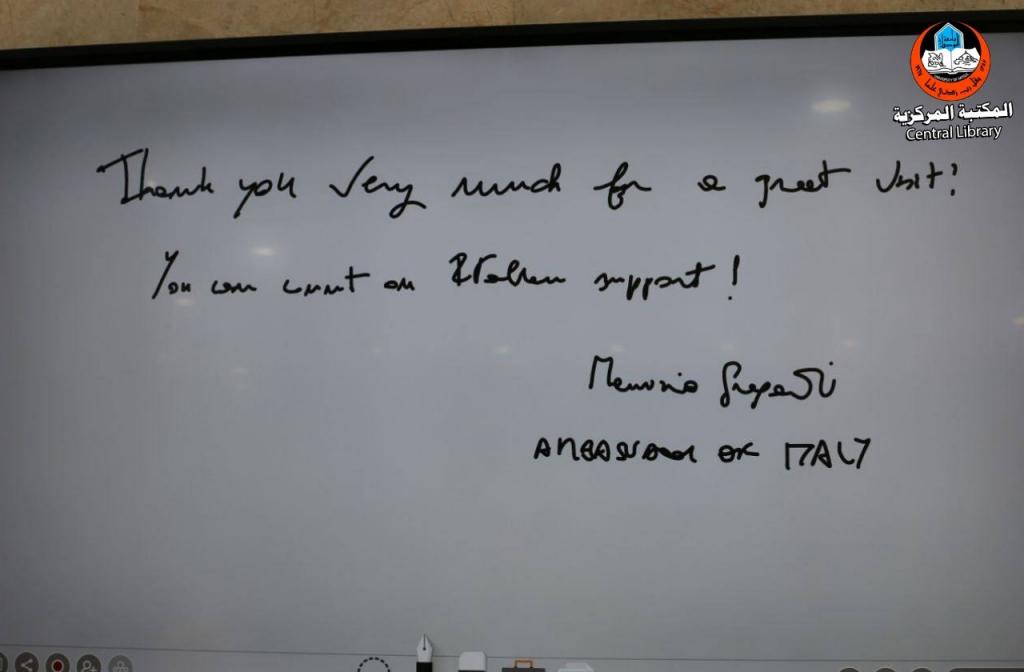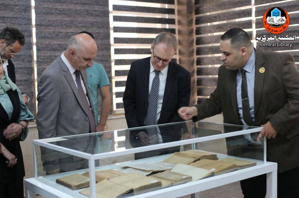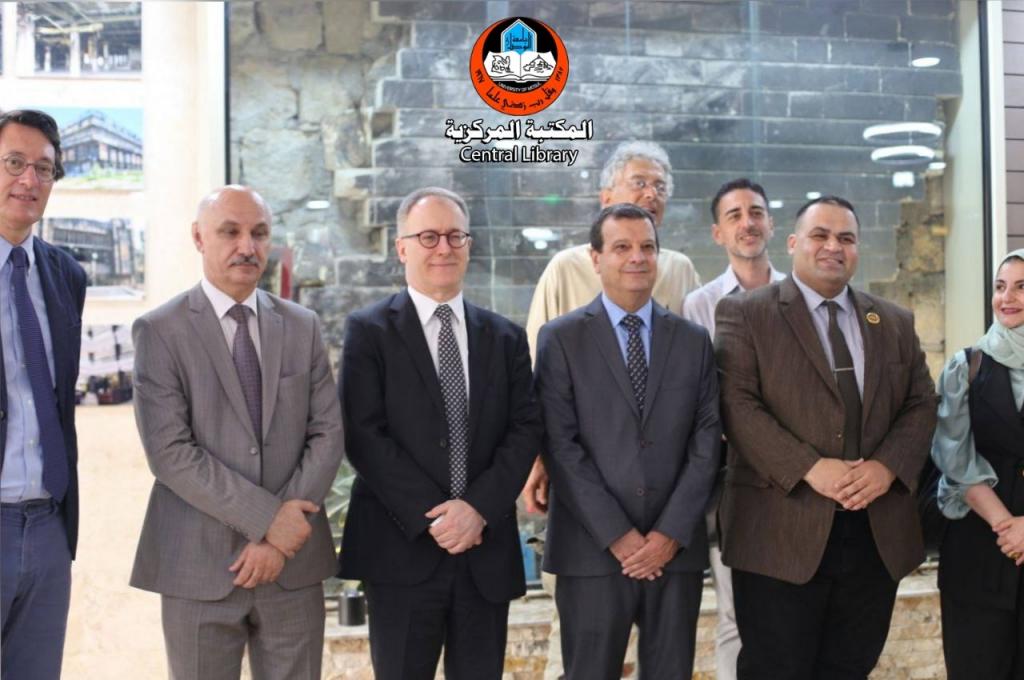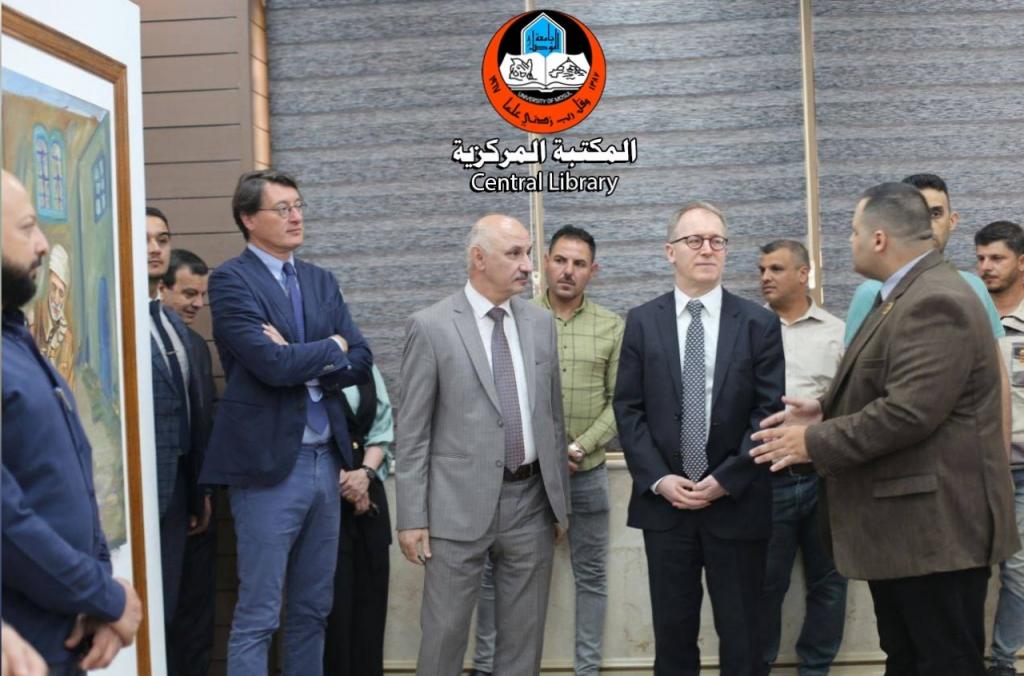 In order to strengthen the bonds of cooperation between Mosul University, headed by Prof. Dr. Kossay Al-Ahmady, and international and local authorities to support the Central Library in the cultural and scientific fields, the University Assistant Rector, Prof. Dr. Wahid Al-Ebrahimi, accompanied by the Dean of the College of Archaeology, the Italian Archeologist Nicola Marceti and a number of administrative officials in the University Presidency, received the Italian Ambassador to Iraq, Maurizio Greganti, who visited the recently constructed Central Library, accompanied by the UNESCO and UNDP delegations. The Secretary General of the University Libraries, Mr. Sayf Al-Ashqar briefed the visitors of the Central Library and its services and the suggested plans set by the University Rector to promote it. The Italian Ambassador expressed his admiration for this achievement, stressing that there will be plans to support the Central Library for its importance in spreading the diverse culture and sciences in the community.