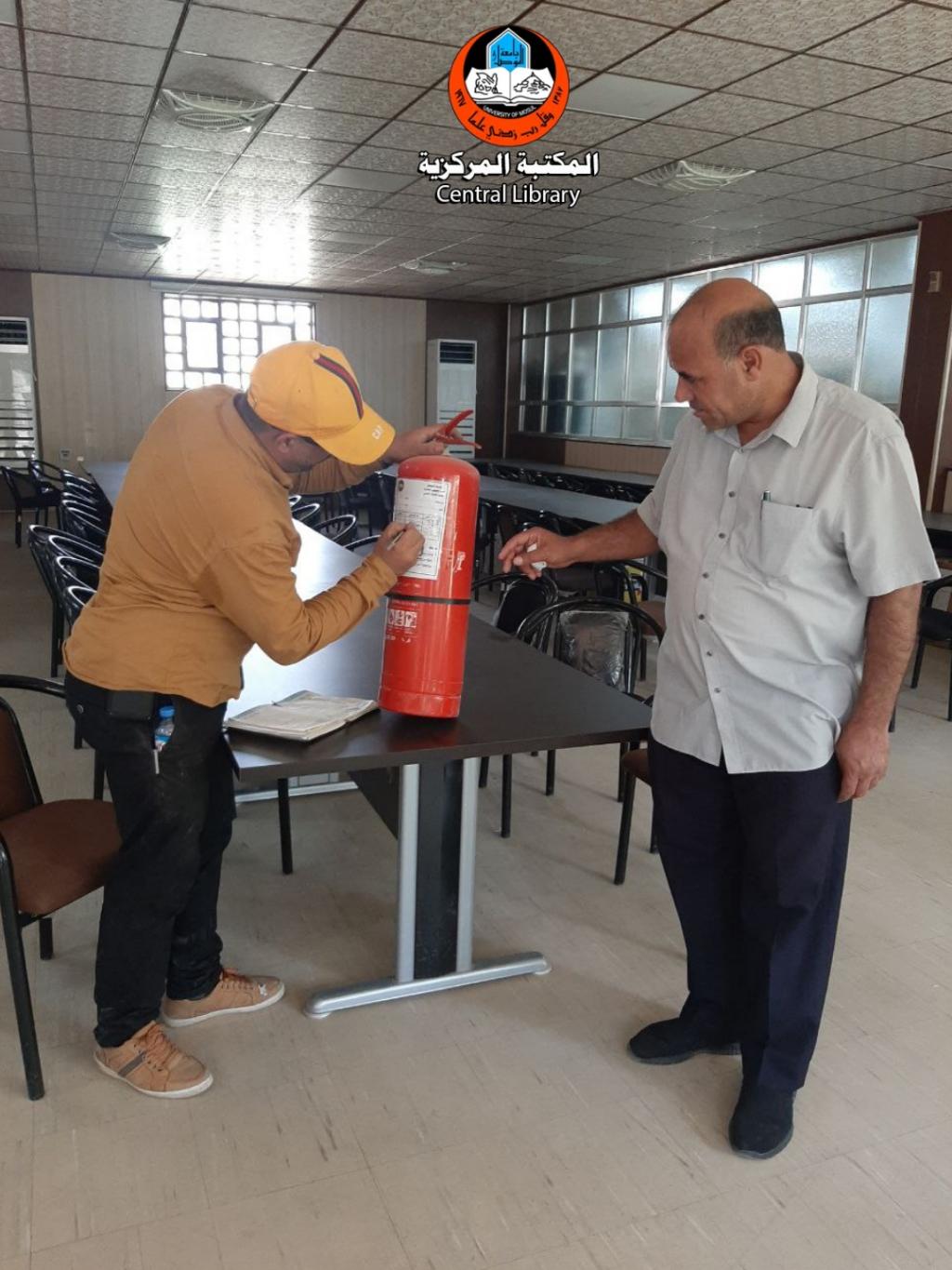 With the follow-up from the General Secretariat of Mosul University Libraries, a committee from the University of Mosul’s Civil Defense visited Ibn Khaldun Library to maintain and examine the extinguishers there to ensure safety for the library employees and users.