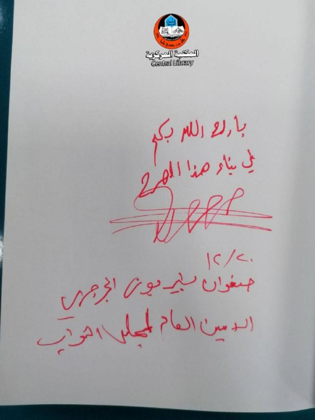 Receiving the Secretary General of the Iraqi Council of RepresentativesThe President of the University of Mosul, Prof. Dr. Kossay Alahmady and his two Assistant Presidents received the Secretary General of the Iraqi Council of Representatives. Mr. Safwan Aljarjari and the accompanying delegation. During the visit, Rector Alahmady and the General Secretary of the University Libraries, Mr. Sayf Al-Ashqar briefed the visitor on the efforts made by the library staff members and local and international supporters to serve the Central Library. The Secretary General of the Iraqi Council of Representatives was impressed by the achievements, stressing the importance of continuous cooperation of the University of Mosul with the state institutions to ensure the provision of the best services to the library users.