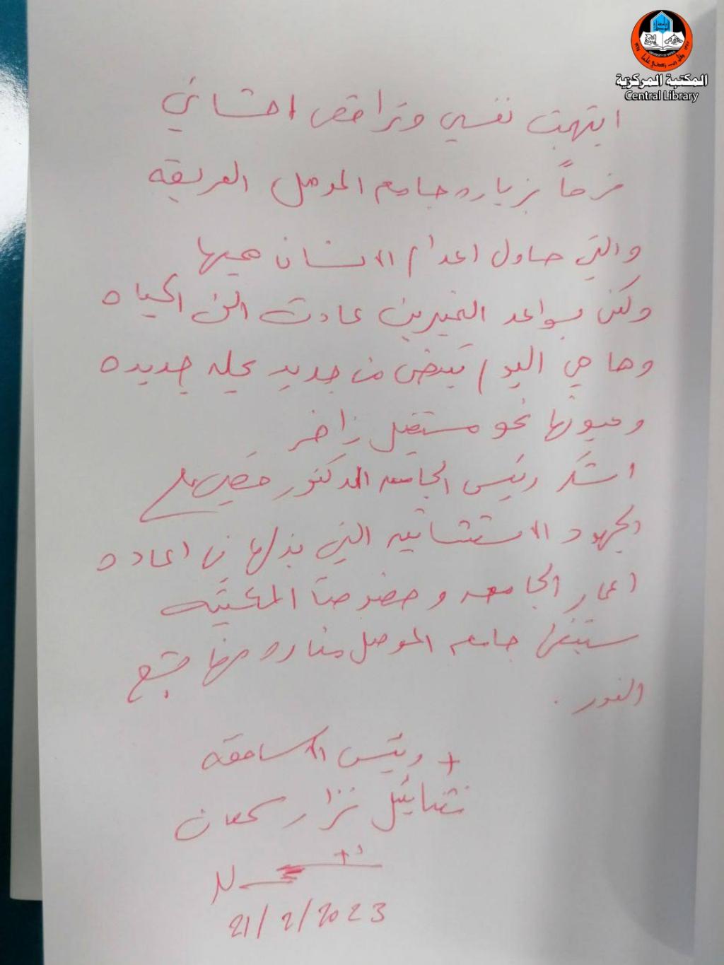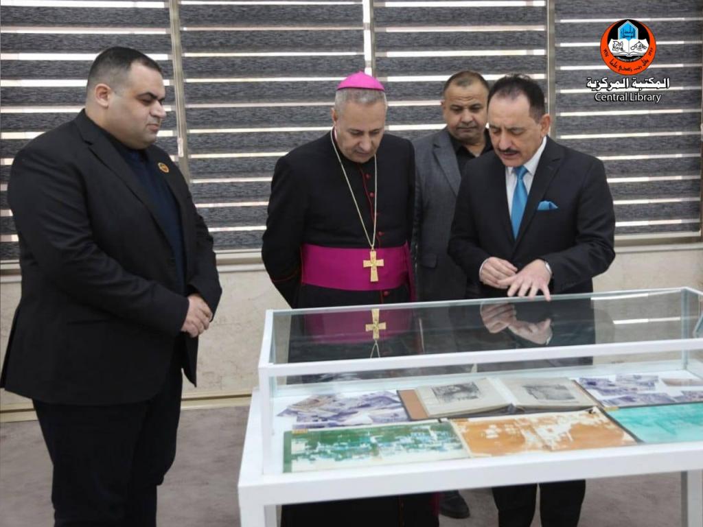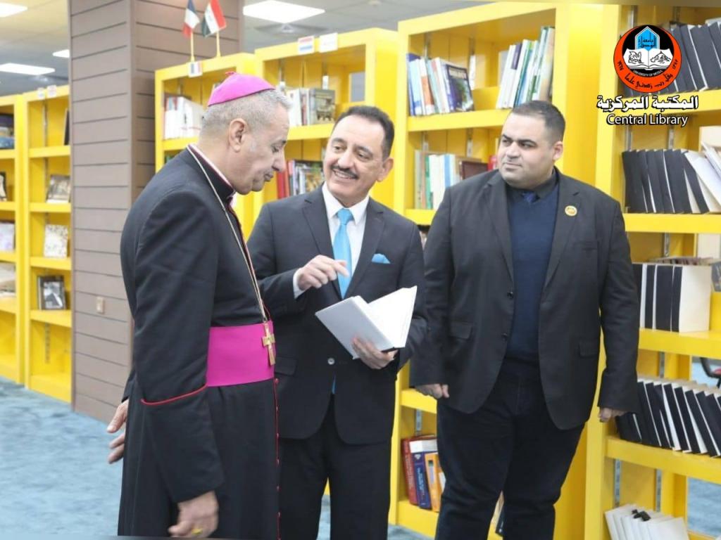 Prof. Dr. Kossay Alahmady, President of the University of Mosul, and Mr. Sayf Al-Ashqar, Secretary General of University Libraries, received Archbishop Mar Nathnael Nizar Sama’an, Head of Hadyab Diocese of Kurdistan Region of Iraq, who visited the Central Library. During his visit, he was taken on a tour of the Central Library and was briefed on the importance of its services provided to its users. At the end of his visit, the archbishop expressed his admiration and appreciation for the efforts made to rehabilitate this cultural and scientific edifice.