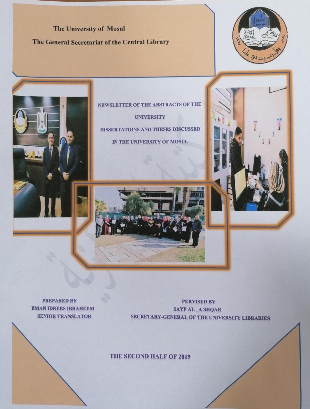 With the vision of Prof. Dr. Kossay Al-Ahmady, President of the University of Mosul, that it is essential to make the most of the digital information in the University’s educational and research processes, and with the supervision of Mr. Sayf Al-Ashqar, Secretary-General of the University Libraries, the Electronic Dissertations Unit in the Central Library issued a bulletin of the University defended dissertations for the second half of 2019, prepared by Ms. Iman Idrees, Chief Programmer. This bulletin is distributed periodically to Iraqi universities and other beneficiaries according to the cognitive exchange and cooperation. http://uomosul.edu.iq/public/files/datafolder_2928/_20200220_115421_540.pdfThe mentioned dissertations of the University of Mosul are in all scientific and human fields to serve the scientific and research movements in our dear country.